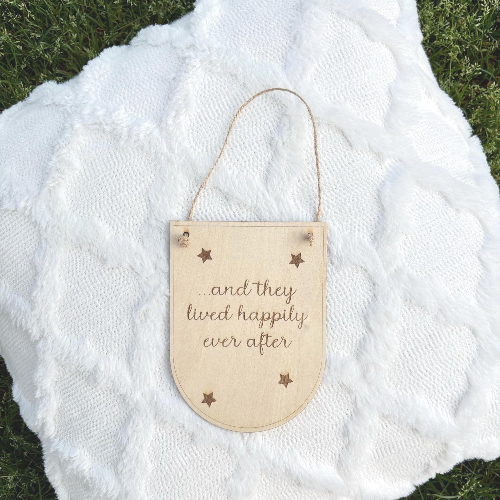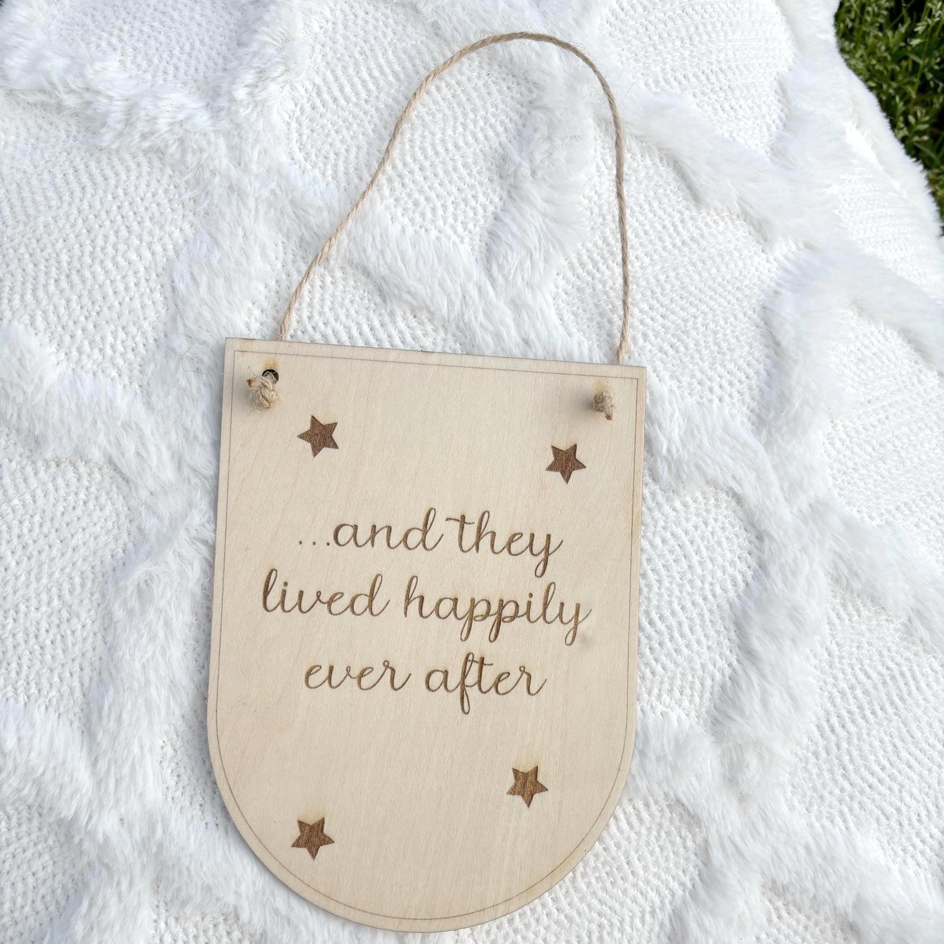 ✨ "...and they lived happily ever after" — the perfect finishing touch to any fairytale-inspired space! This wooden banner sign is laser-engraved with a classic storybook quote and accented with charming engraved stars ⭐, creating a magical, heartwarming feel.